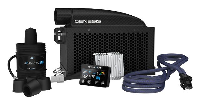CHILLOUT GENESIS(チルアウト ジェネシス)はCHILLOUTドライバー冷却システム最強の冷却性能を持つ氷を使用しない新世代のドライバークーリングシステムです。マイクロコンプレッサーによって冷却された水を循環させるこのシステムは、安定した冷却水温度の調整が可能となり、レース中の氷の補充も不要です。